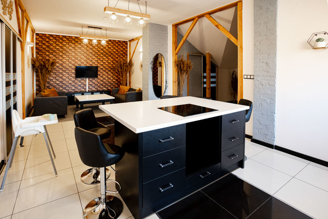 Bardzo duży, nowo wybudowany domek całoroczny stylizowany na czasy PRL. Dom składa się z salonu z aneksem kuchennym, dwóch pokoi oraz łazienki.