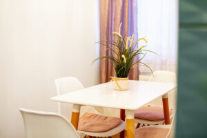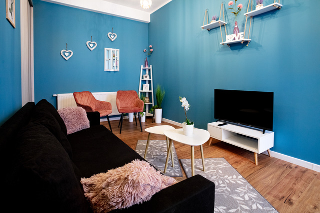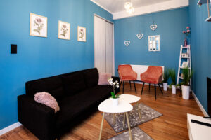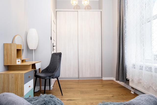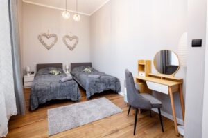 Apartament w Kruszwicy. Lokal czteroosobowy 60 Mk. sypialnia, salon z kuchnią, łazienka i garderoba.